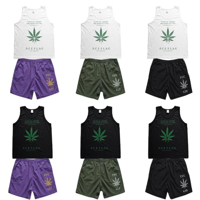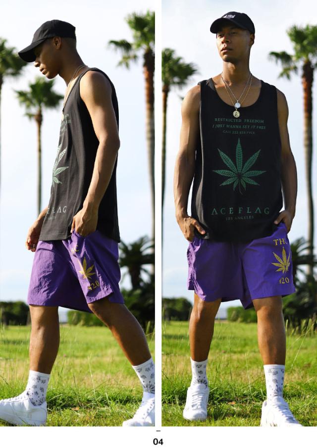 ACEFLAGを代表する「ヘンプ」ロゴをドロップしたタンクトップと麻の葉に関するスラングや隠語を冠したナイロンハーフパンツの上下セット。