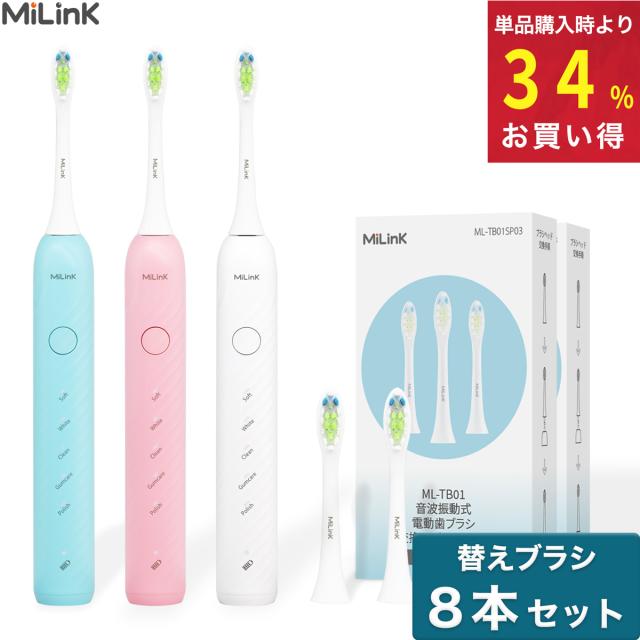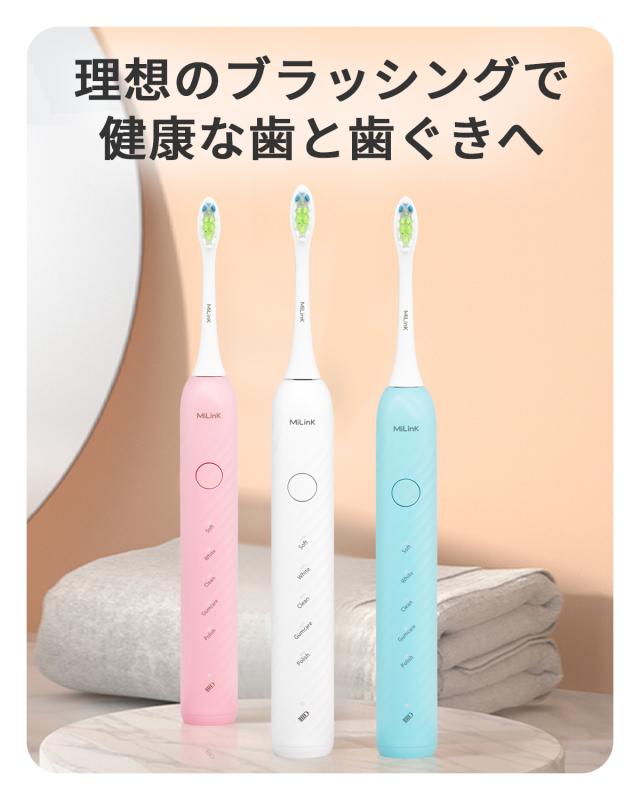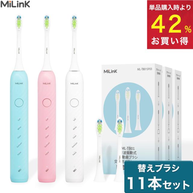 【IPX7防水 37800回転/分】【電動歯ブラシ + 替えブラシ11本付き】 音波式電動歯ブラシ 音波歯ブラシ 音波振動歯ブラシ 5つのブラックモード 防水 静音設計 タイマー機能 大人 子供 コンパクト やわらかめ デュポンブラシ MiLink TB01 「ホワイト/ブルー/ピンク」