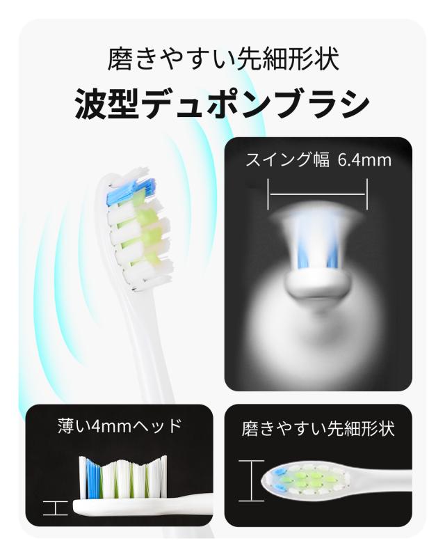 届きにくい歯間も磨ける 先細ブラシヘッド 薄さ4mm、11mmの先細形状で、届きにくい奥歯の歯周ポケットまで的確に磨きあげます。ブラシは口内を傷つけないボール状の毛先加工と、幅広いニーズに対応する「ふつう」の硬さの波型のデュポンブラシを採用。