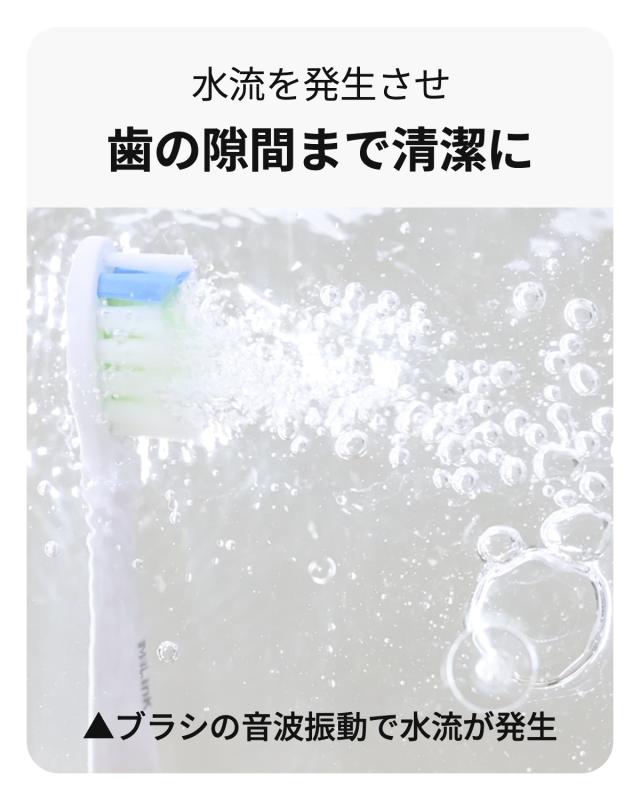 音波振動で 口内を隅々までケア リニア音波振動は汚れをたたき落とすだけでなく、口内に気泡や水流を発生させ、毛先の当たりにくい歯間や奥歯まで磨き上げます。
