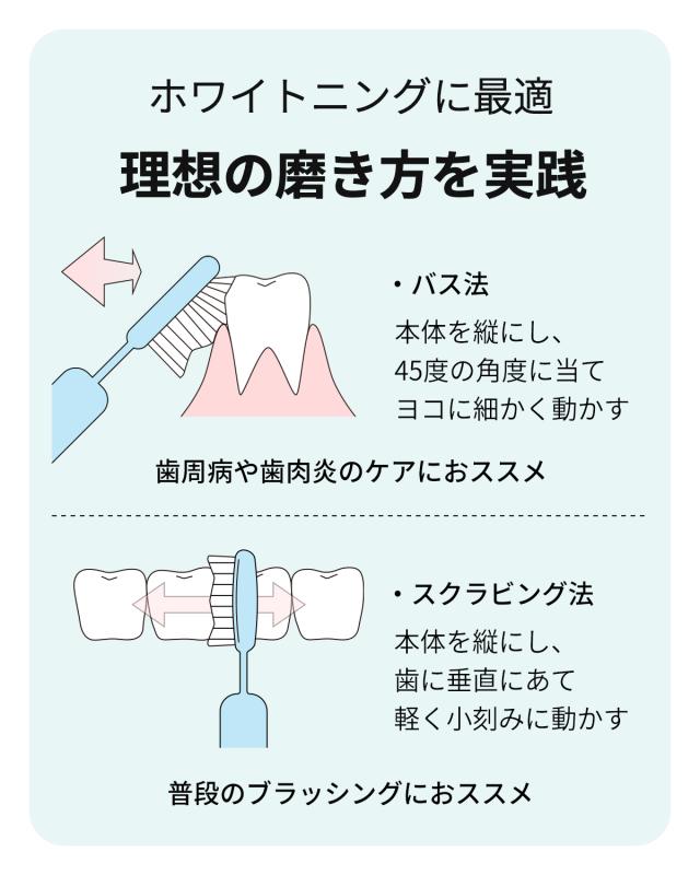 洗浄力を高める ブラッシング方式 本体を縦にする事で、歯科医師推奨の「バス法」と「スクラビング法」を実践。 口内トラブルの原因となる歯周ポケットや歯間の汚れを取り除きます。