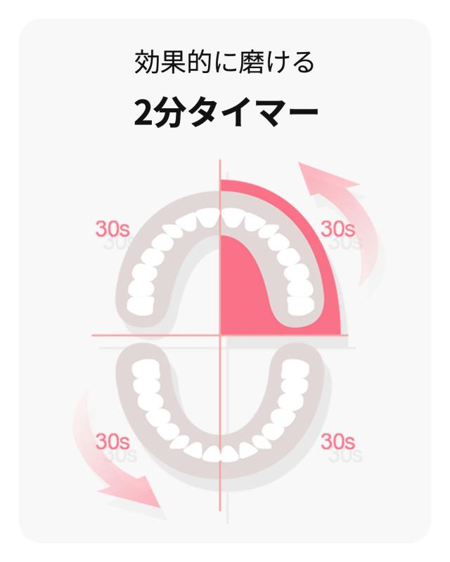 忙しい日でも効率アップ ブラッシングタイマー機能 2分間のタイマー機能と30秒ごとに一瞬停止するインターバル機能で、ブラッシングの区切りをお知らせ。 口腔内を4箇所に分け、それぞれ一定の間隔で効率よくブラッシングする事ができます。