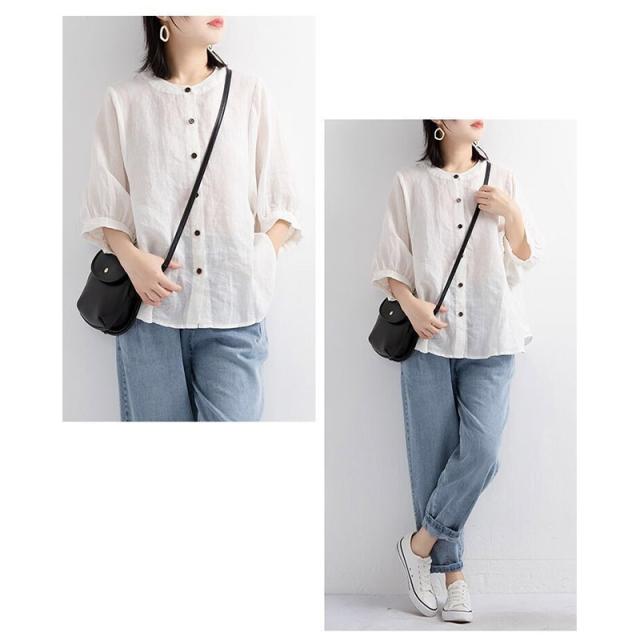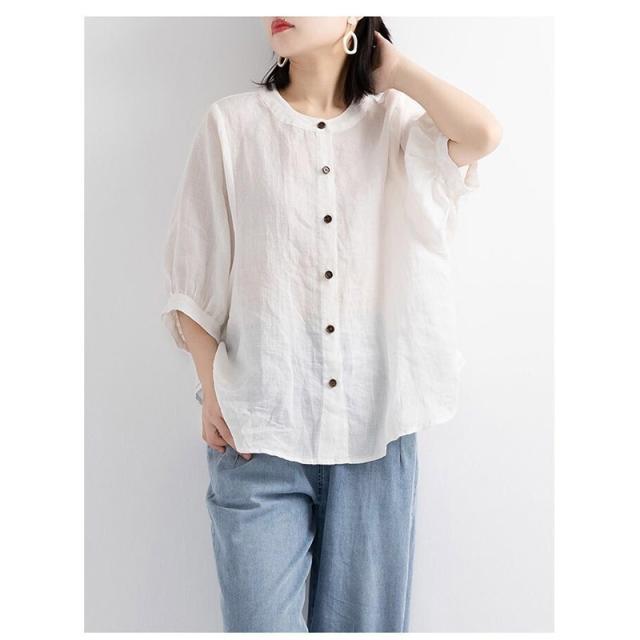 レディース 丸襟 半袖 リネンシャツ ブラウス 夏 トップス カジュアル 無地 ナチュラル 春 羽織り シャツ 大きいサイズ 体型カバー