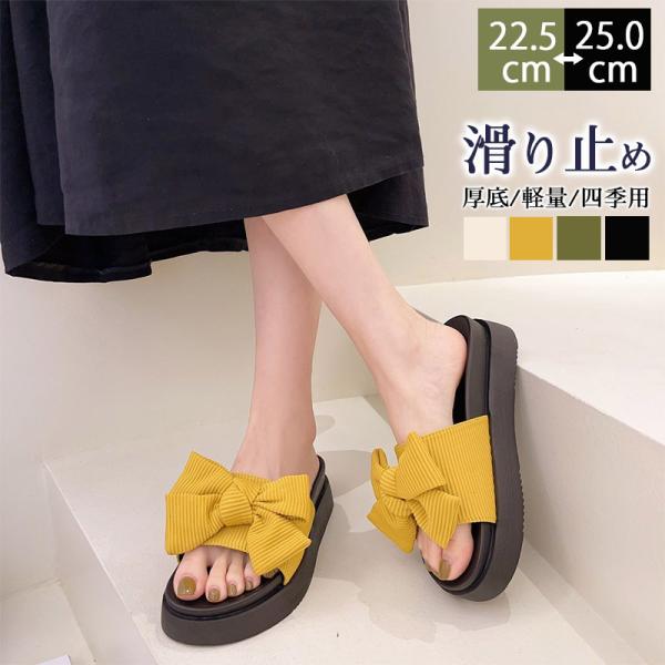 厚底スリッパ レディース おしゃれ かわいい サンダル ぺたんこ フラット リボン 前あき 幅広 ルームシューズ 可愛い ベランダ 室内 外履き