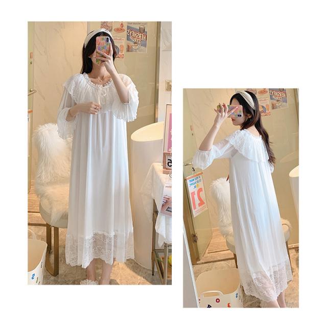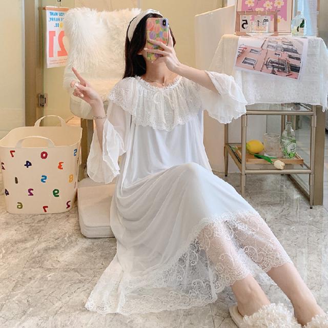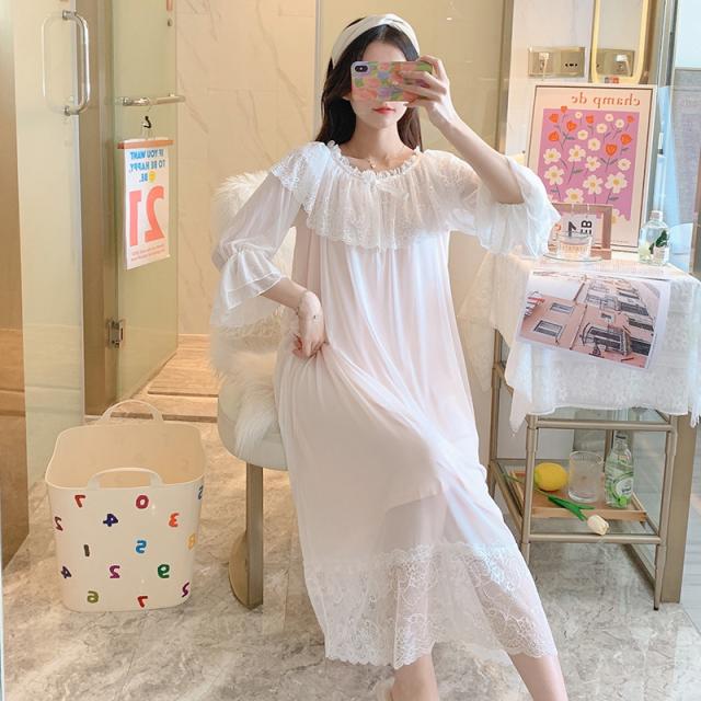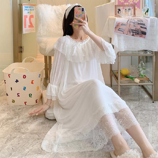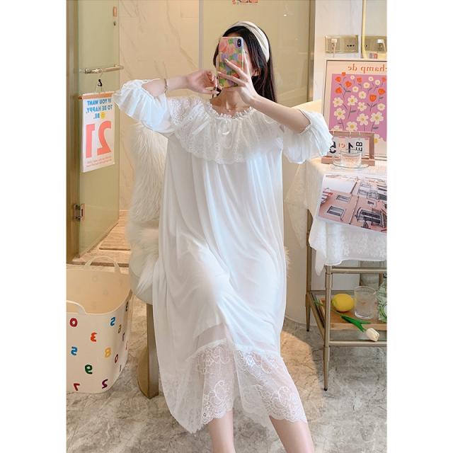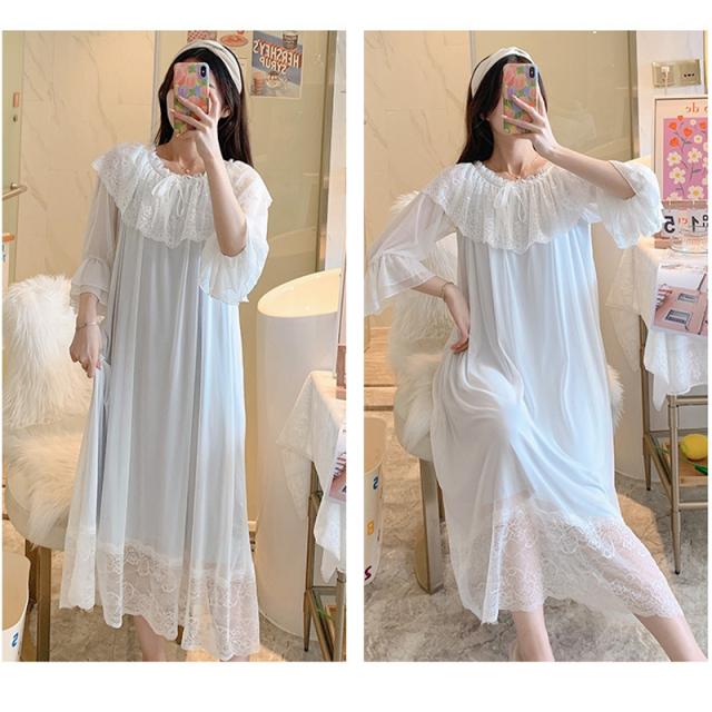3色!春夏新作 レディース フリル チュール 姫系 ネグリジェ 寝巻きロング丈 レース ルームワンピース パジャマ ナイトウエア ナイティー