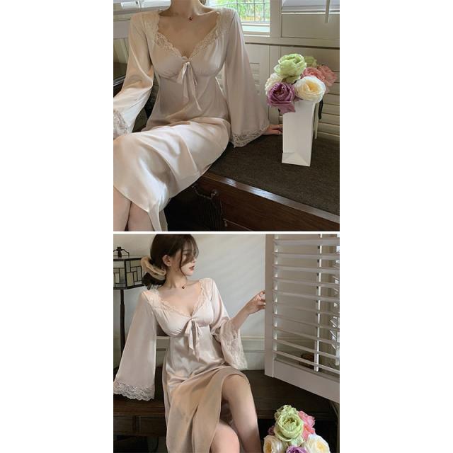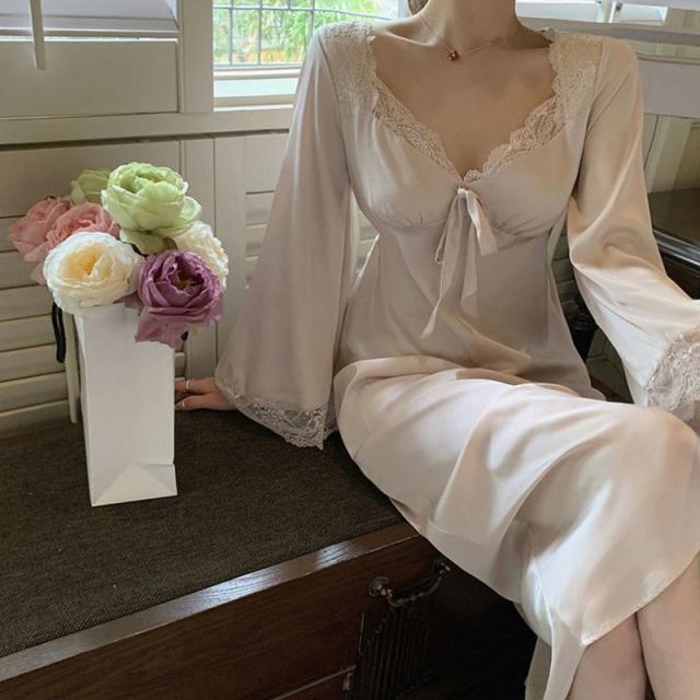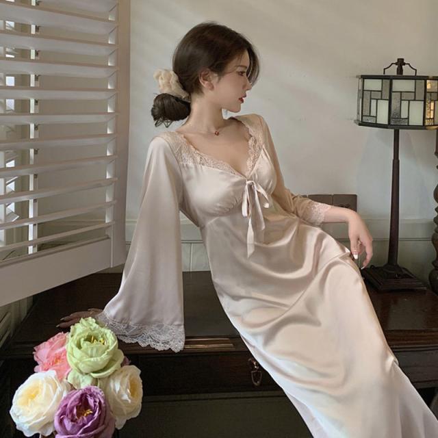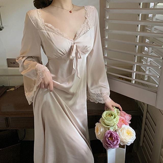 ネグリジェ 春夏秋 長袖ネグリジェ 姫風ワンピース ロング丈 レースVネックネグリジェ ナイトロープ ルームウェア レションパジャマ レディース 大人