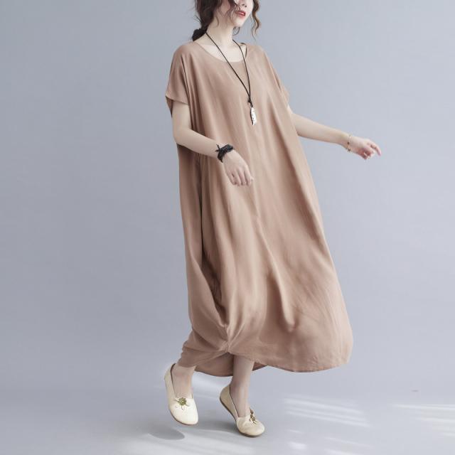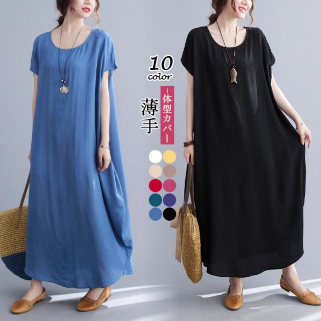 ワンピース ロングワンピース 夏ワンピース バルーンタイプ 体型カバー ロング丈 シンプル カラバリ 半袖 ゆったりワンピース かわいい ナチュラル服