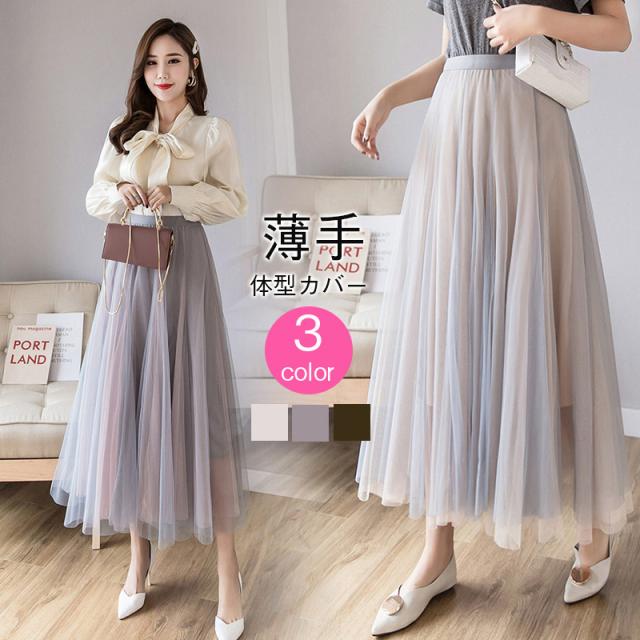 チュールスカート スカート マキシスカート ロングスカート 配色 フレアスカート ウエストゴム マキシスカート お花見 春夏 春秋 綺麗 お洒落