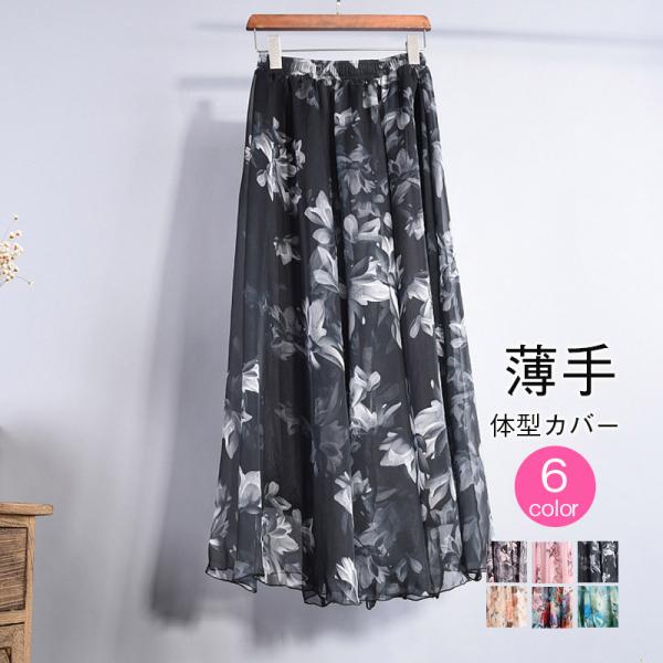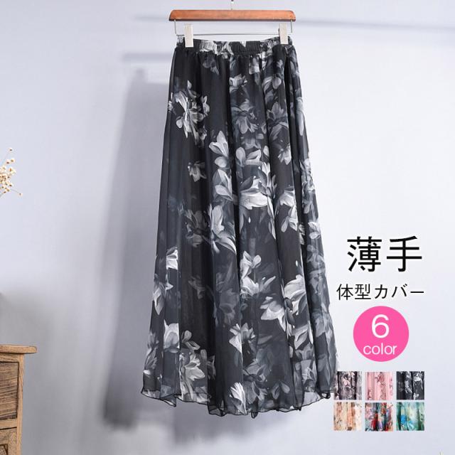 マキシスカート スカート 花柄 フレアスカート レディース マキシ丈 ロングスカート Aライン 着痩せ フレア シフォン ウエストゴム お花見