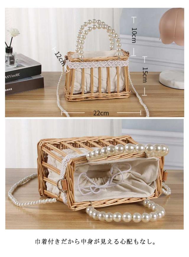 かごバッグ 巾着 内袋 柳 天然素材 レディース カゴバッグ 小さめ パール 持ち手 ショルダー トートバッグ スクエア 大容量 自立 軽量 手提げ 籠バッグ 巾着袋 耐水 浴衣 花火大会 バスケットバッグ お花見 大人 かわいい おしゃれ 【送無】
