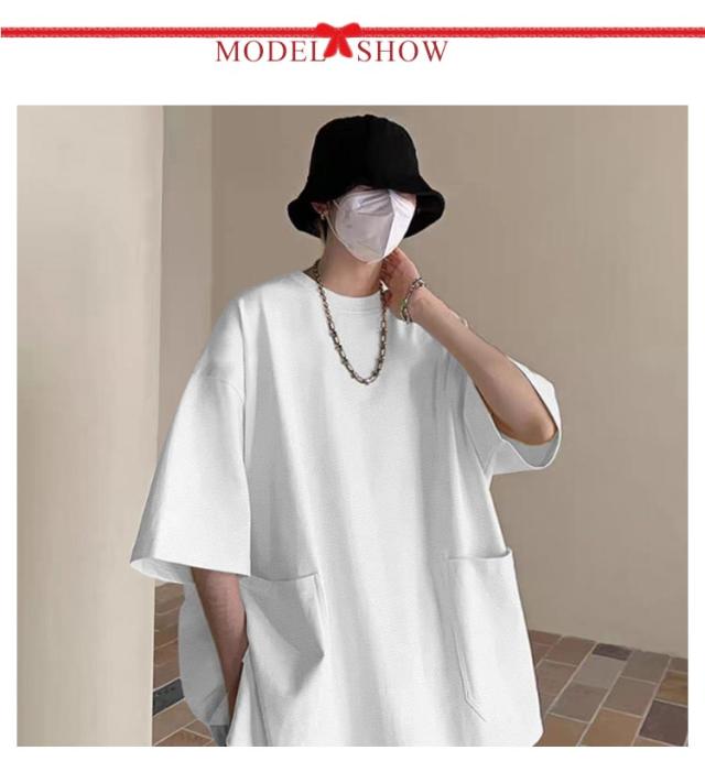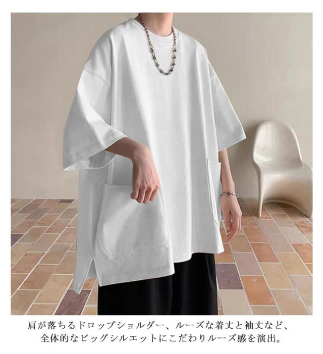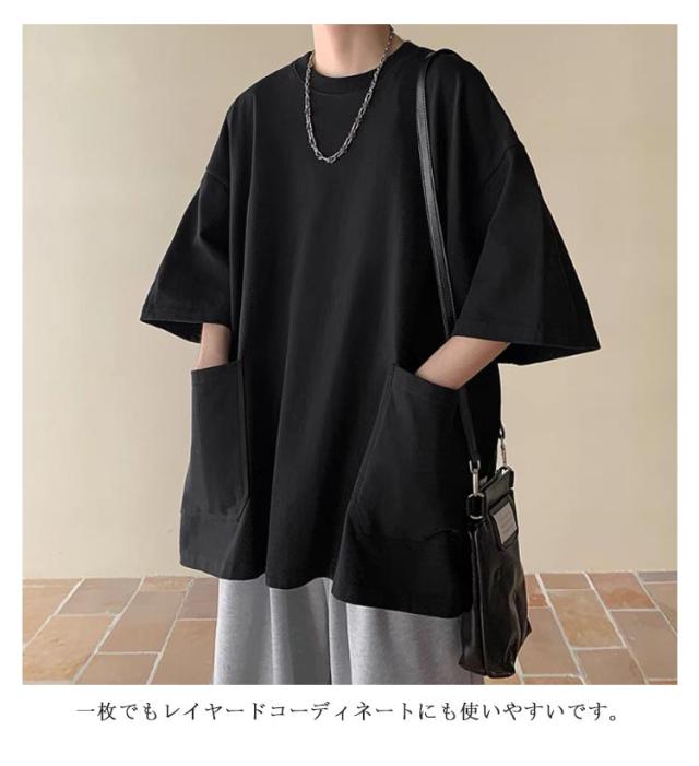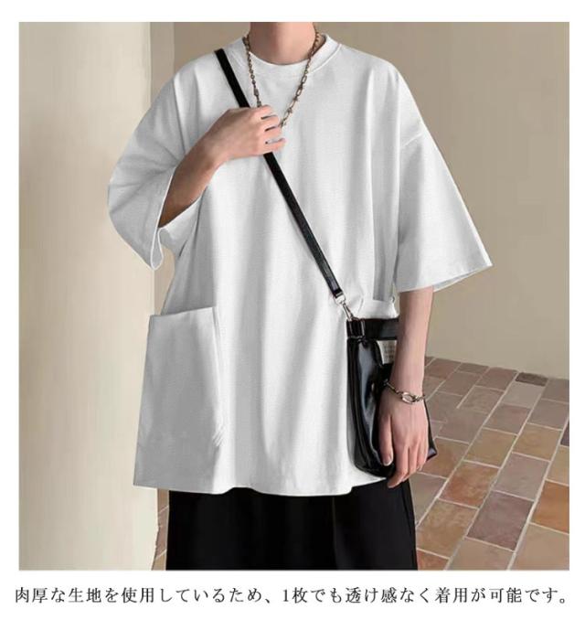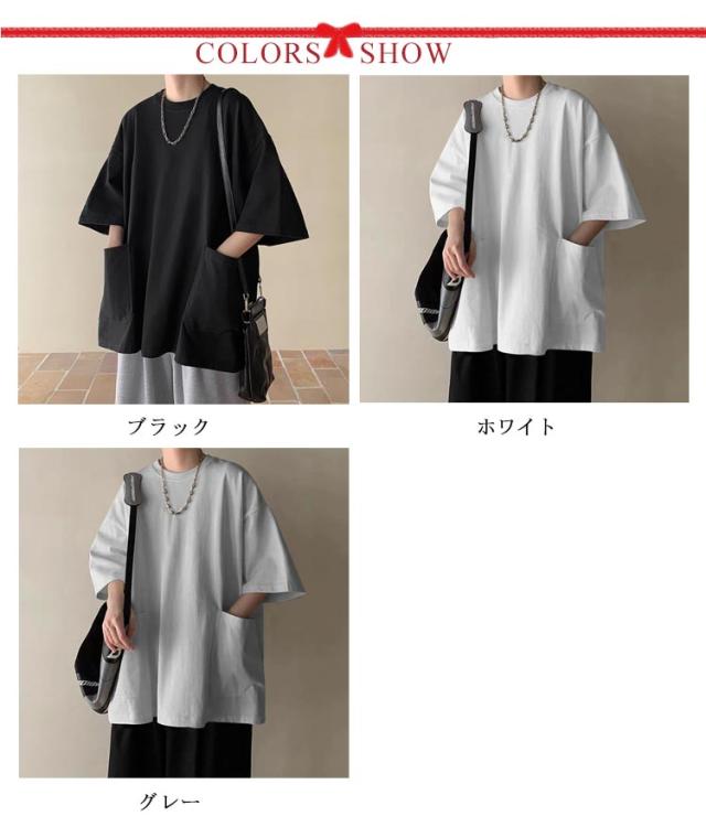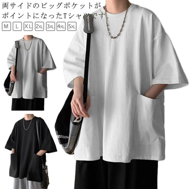 メンズ tシャツ 半袖 クルーネック ビッグシルエット ポケット付き 5分袖 ビッグtシャツ カットソー 韓国 ファッション ルーズ 半袖tシャツ オーバーtシャツ 大きいサイズ 黒 白 グレー ブラック ホワイト 無地 夏 トップス 【送料無料】