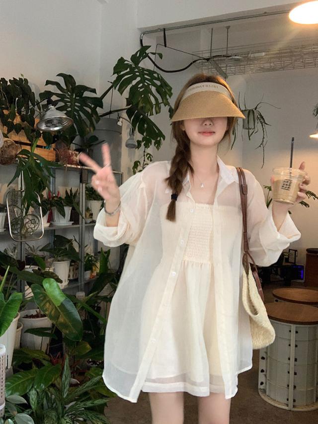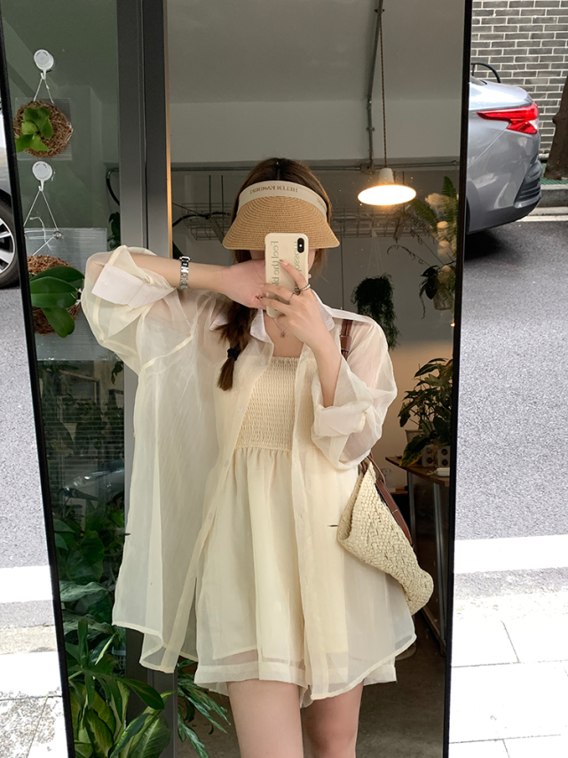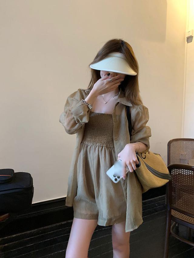 送料無料 シアーシャツ オーバーサイズ シャーリング キャミソール オールインワン ショートパンツ つなぎ 2点セット セットアップ シャツ 長袖シャツ 夏シャツ 長袖