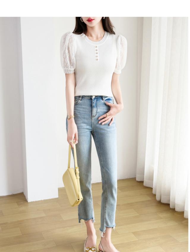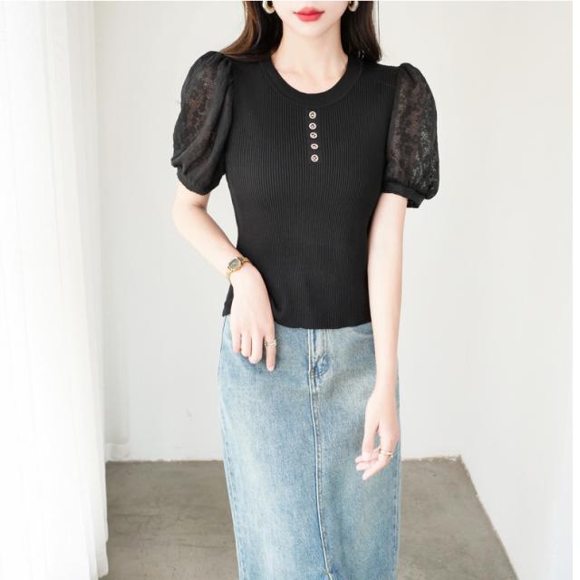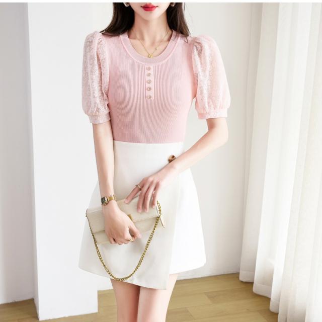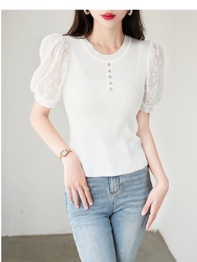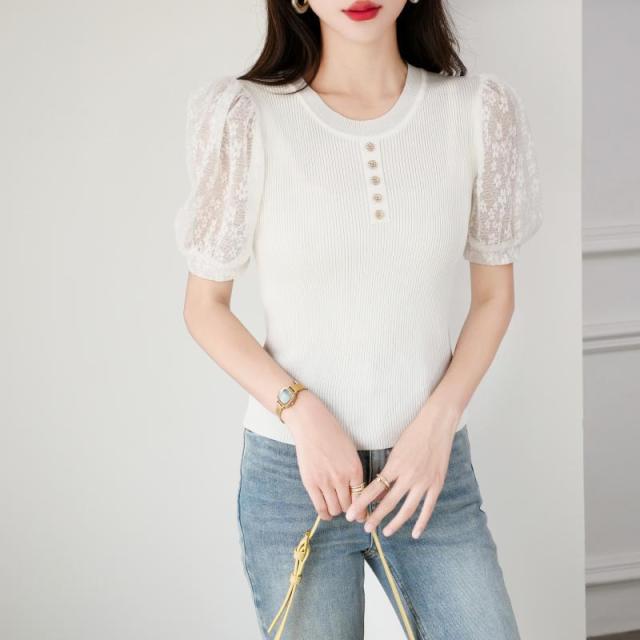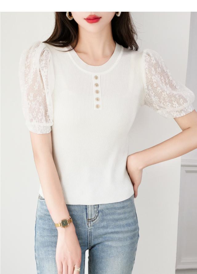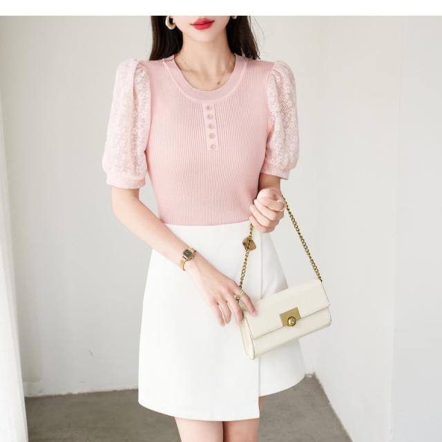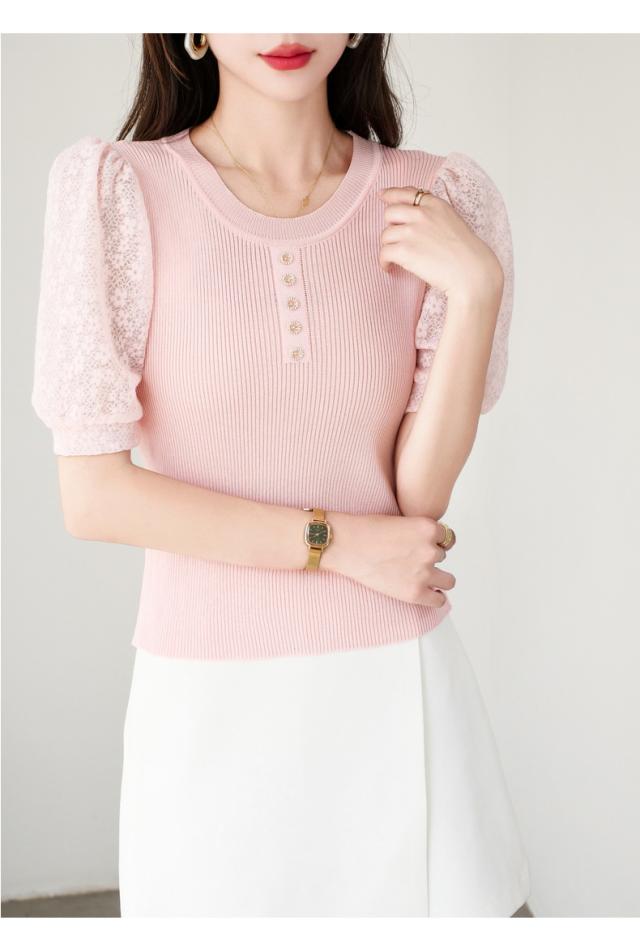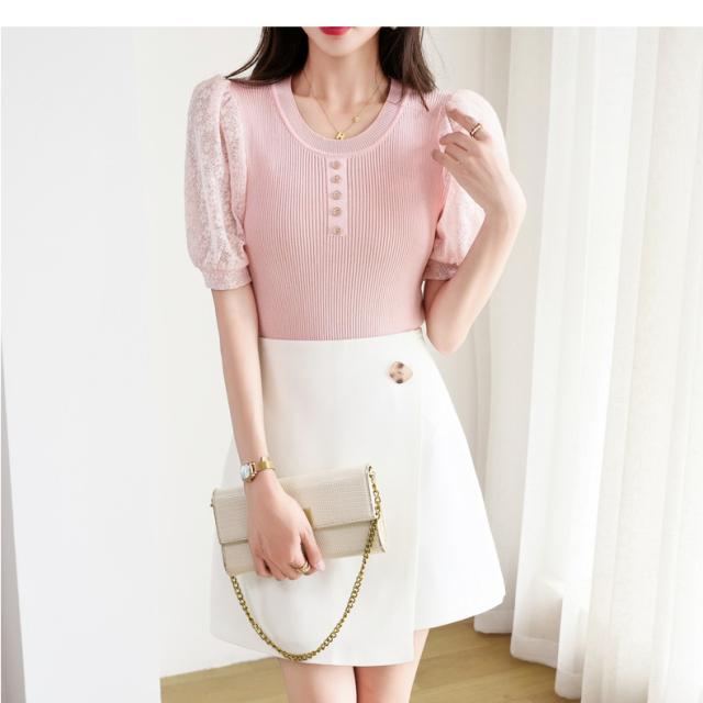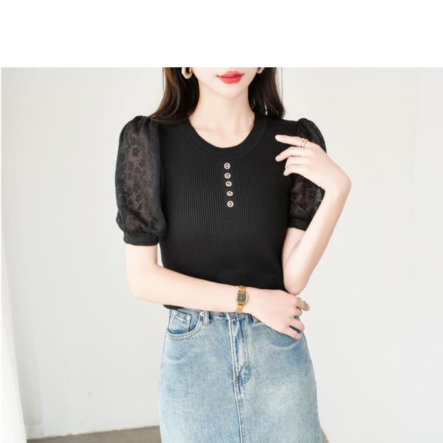 サマーニット レディース 半袖 レース パフスリーブ 花柄 シースルー カットソー Tシャツ ニットトップス 夏 可愛い きれいめ