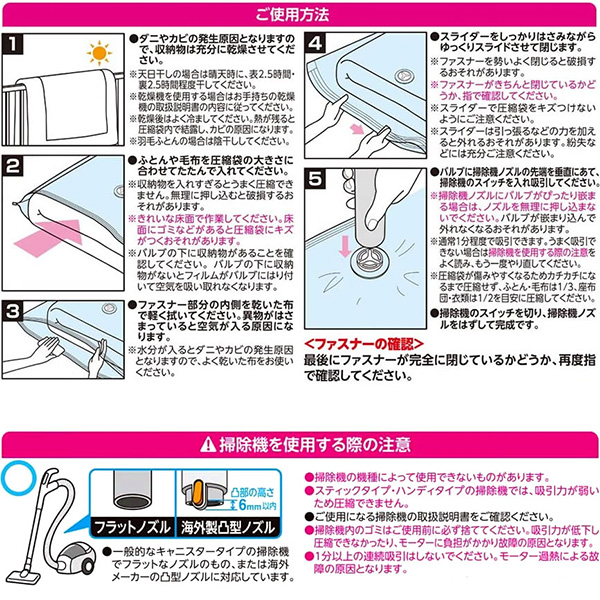 材質:圧縮袋/ナイロン、ポリエチレン バルブ/ポリプロピレン、ポリエチレン、シリコーン樹脂、スライダー/ポリプロピレン