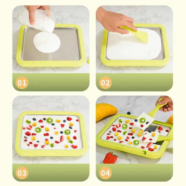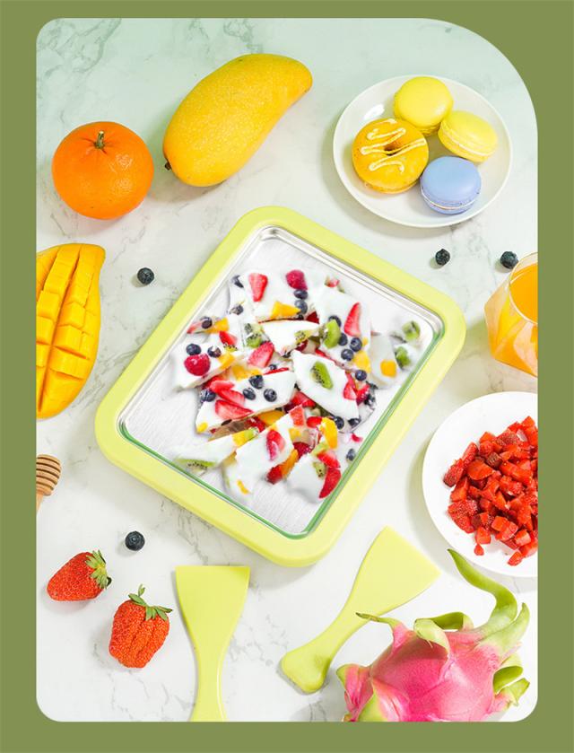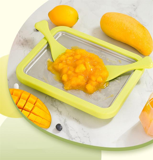 冷蔵された材料を冷凍パンに注ぎ、アイスクリームが形成されるまで待って回転させ、へらを使ってしいアイスクリームロールを作ります。