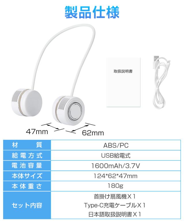 最新モデルの首掛け扇風機です。首バンドを両側に引き伸ばして“U”の形に固定して首にかけます。