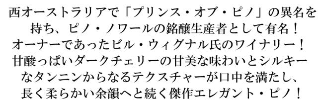 西オーストラリアで「プリンス・オブ・ピノ」の異名を 持ち、ピノ・ノワールの銘醸生産者として有名!オーナーであったビル・ウィグナル氏のワイナリー!甘酸っぱいダークチェリーの甘美な味わいとシルキー なタンニンからなるテクスチャーが口中を満たし、 長く柔らかい余韻へと続く傑作エレガント・ピノ!■さまざまなギフトアイテムをご用意しております。