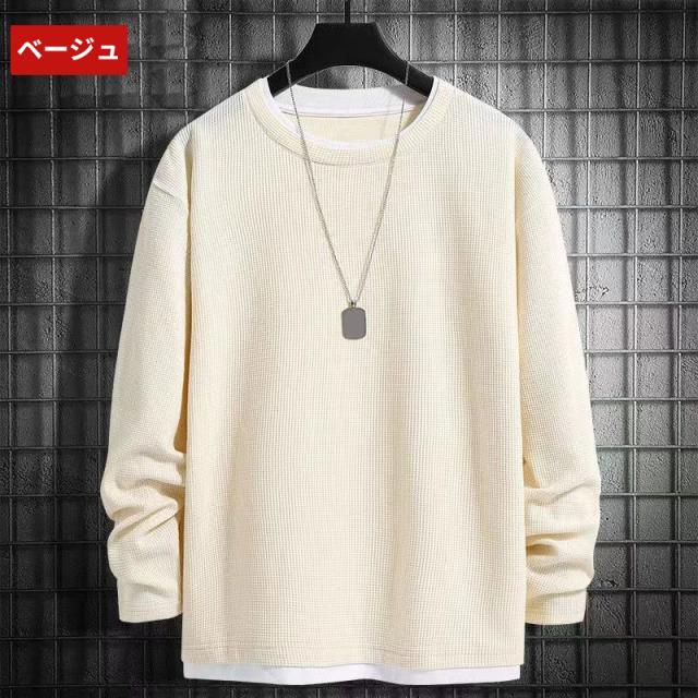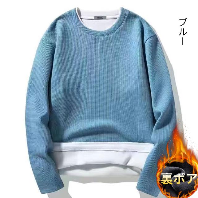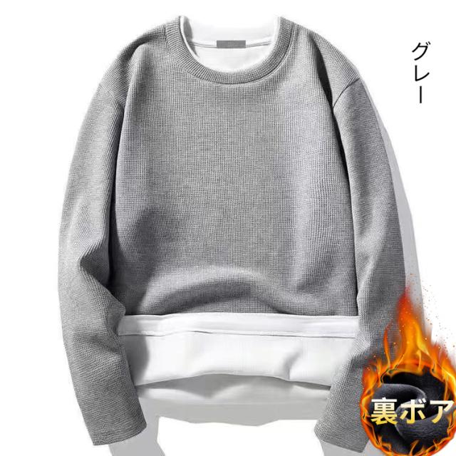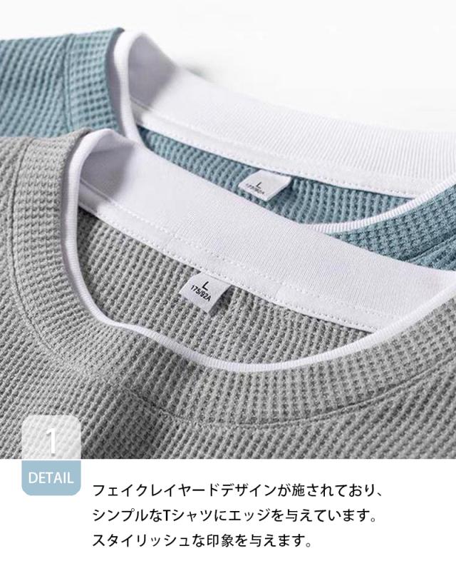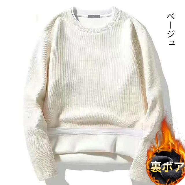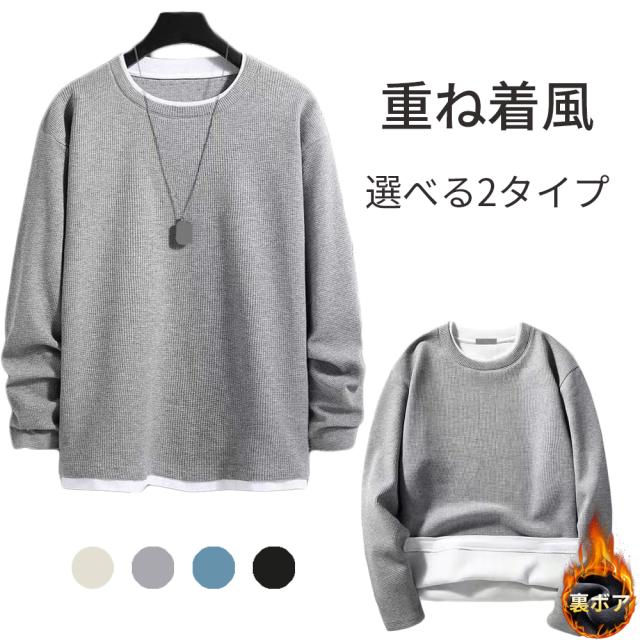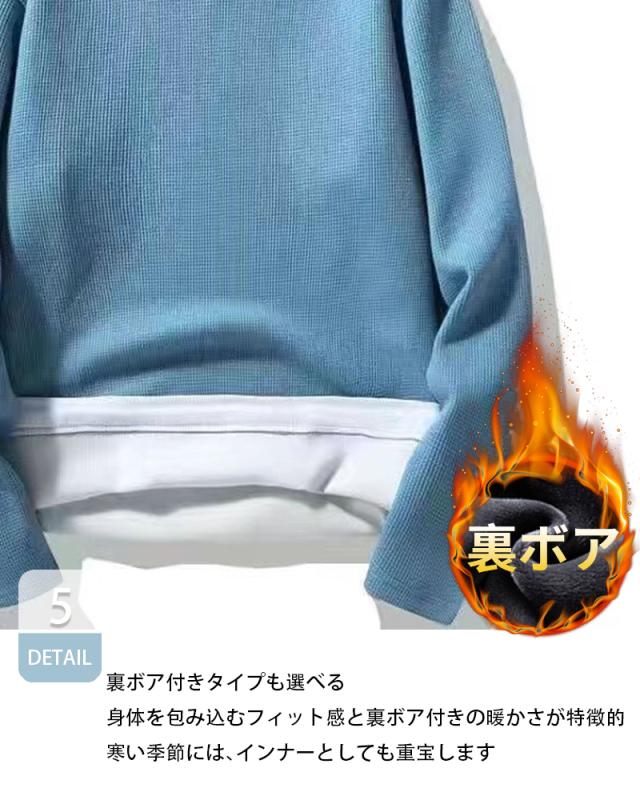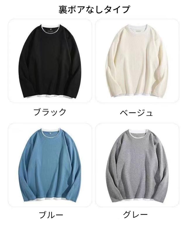 Tシャツ長袖カットソー長袖ワッフルェイクレイヤード裏起毛裏ボア暖かいワッフルサーマル2タイプトップスインナー Uネック クルーネックトップス男女兼用