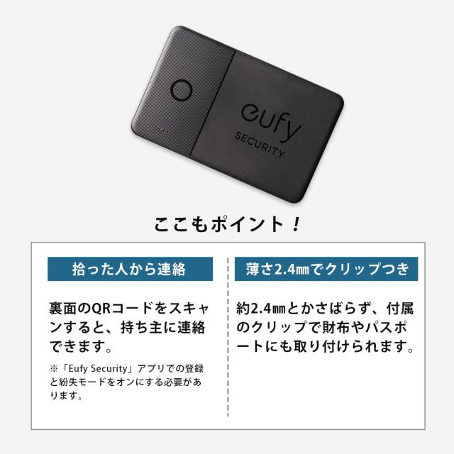 | パッケージ内容 | Eufy Security SmartTrack Card、メタルクリップ、クイックスタートガイド、※マニュアル |