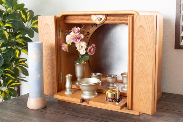 円筒型コードレスタイプは、お盆提灯の中でも近年主流のスタイル。置き場所に困らず、組み立てや分解収納が不要です。高さは25センチと小型のモダン仏壇にもぴったりとフィットするサイズ。台座は木目を生かした天然木のくり抜きとなっています。電源が入っていない時も、しっとりと和のたたずまい。 |