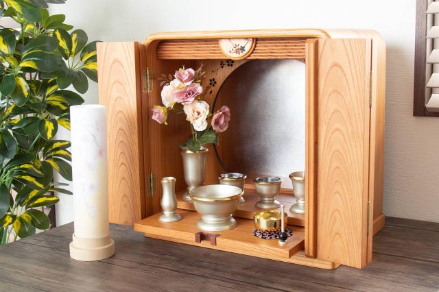 円筒型コードレスタイプは、お盆提灯の中でも近年主流のスタイル。置き場所に困らず、組み立てや分解収納が不要です。高さは24.5センチと小型のモダン仏壇にもぴったりとフィットするサイズ。台座は木目を生かした天然木のくり抜きとなっています。電源が入っていない時も、落ち着いた和のたたずまい。