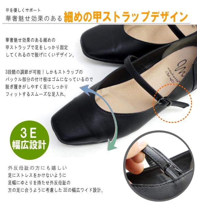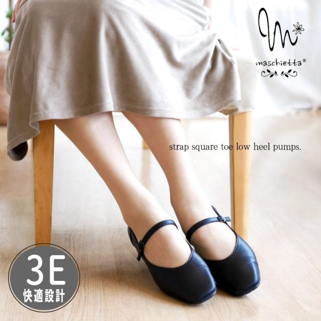 maschietta マスチェッタ パンプス スクエアトゥ 靴 レディース 甲ストラップ 太目 ローヒール 安定感 耐滑 軽い 黒 柔らかい 痛くない 足を圧迫しない 冠婚葬祭 通勤 お仕事 3e 屈曲