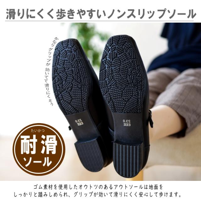 安定感のある太めヒールに屈曲性の良い底で滑りにくい耐滑仕様が快適な履き心地を演出。