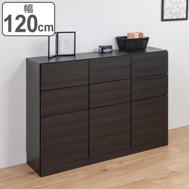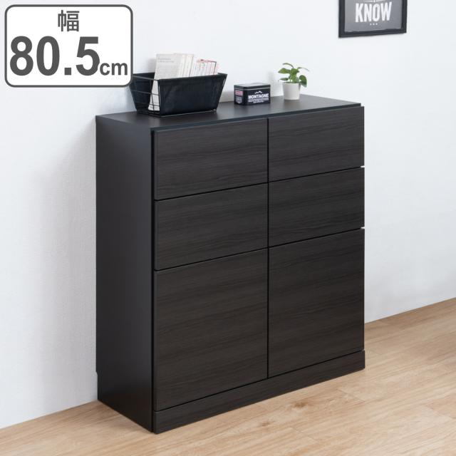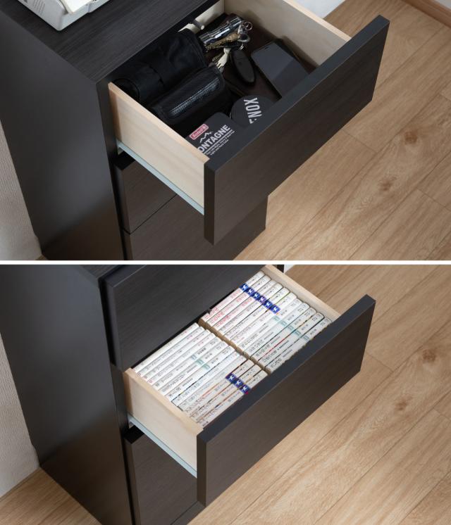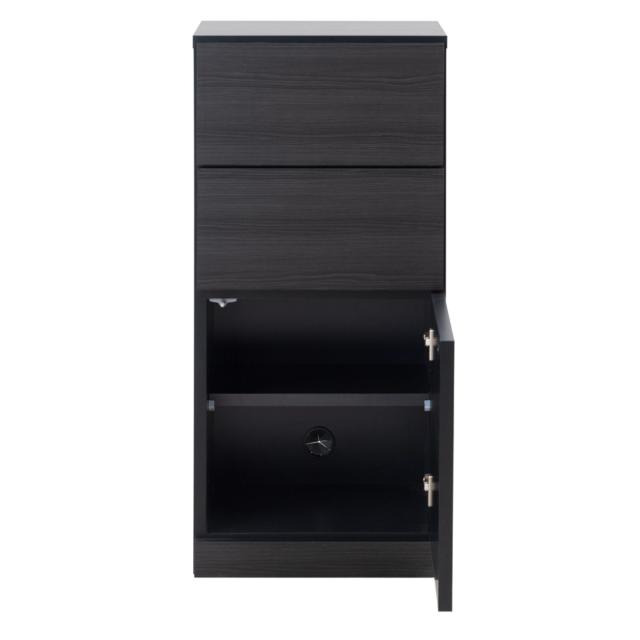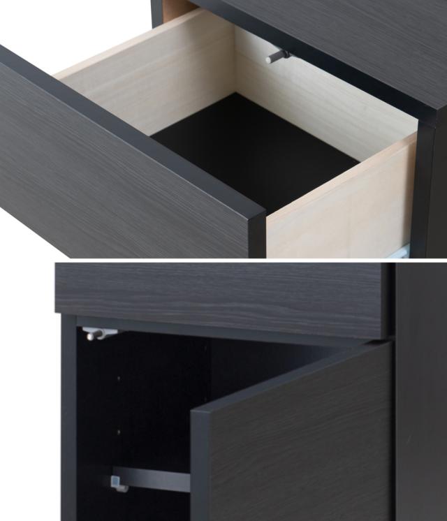 2杯の引出しと片開き収納が付いたカウンター下収納です。傷がつきにくい強化プリント紙を使用した木目の入ったブラックが、高級感のあるお部屋を演出します。