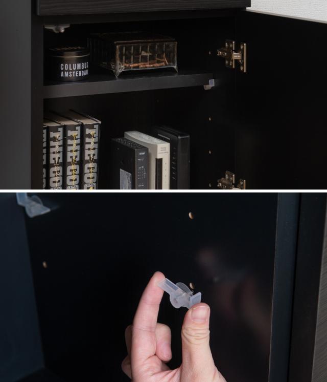 扉の内部には、6cmピッチで5段階の調節ができる可動板が1枚付いています。また、棚板を置く金具には特殊な加工が施されているので、ずれたり外れたりすることがなく、安心してお使いいただけます。