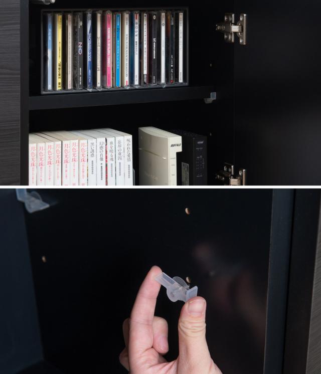 各扉にはそれぞれ、6cmピッチで5段階の調節ができる可動板が1枚付いています。また、棚板を置く金具には特殊な加工が施されているので、ずれたり外れたりすることがなく、安心してお使いいただけます。