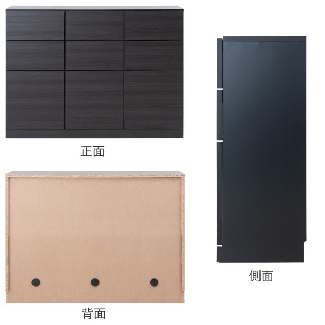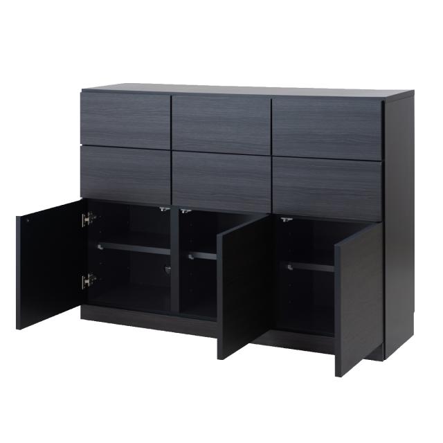 6杯の引出しと3つの扉収納スペースが付いたカウンター下収納です。傷がつきにくい強化プリント紙を使用した木目の入ったブラックが、高級感のあるお部屋を演出します。