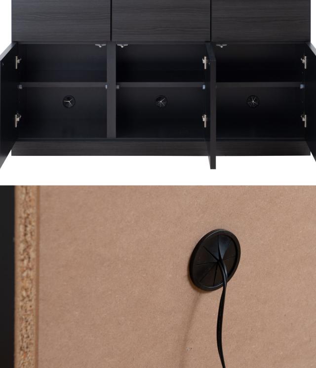 各扉ごとに1個ずつコード穴があるので、配線がしやすい設計になっています。棚板の後ろに隙間ができる仕様になっているので、扉内での配線も可能です。