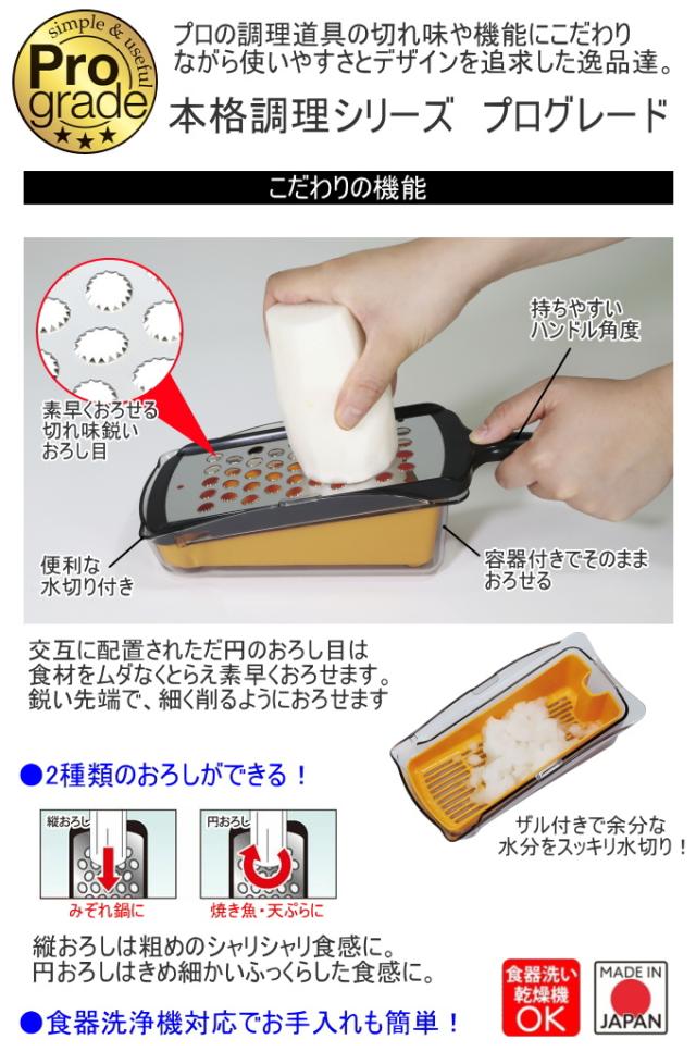 ご家庭にプロの料理を。本格調理シリーズ、プログレード。 プロの調理道具の切れ味や機能にこだわりながら使いやすさとデザインを追求した逸品。 切れ味鋭いおろし目でふわシャキおろしが素早くできます。 おろし方によって2種類の食感が楽しめます。 縦おろしはシャリシャリ食感。みぞれ鍋に最適。 円おろしはふっくら立ち上がった柔らかい食感で焼き魚や天ぷらに最適です。 容器と水切りザル付きでおろしてそのまま水切りできます。 食器洗い乾燥機に対応。 |