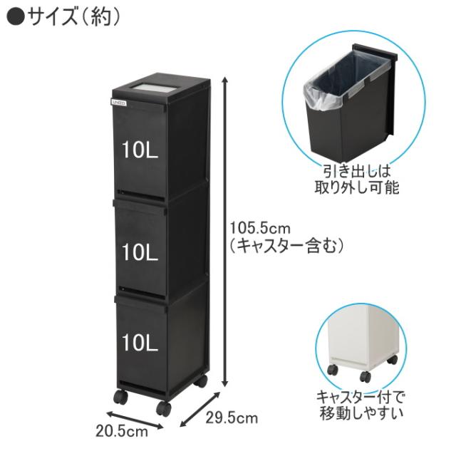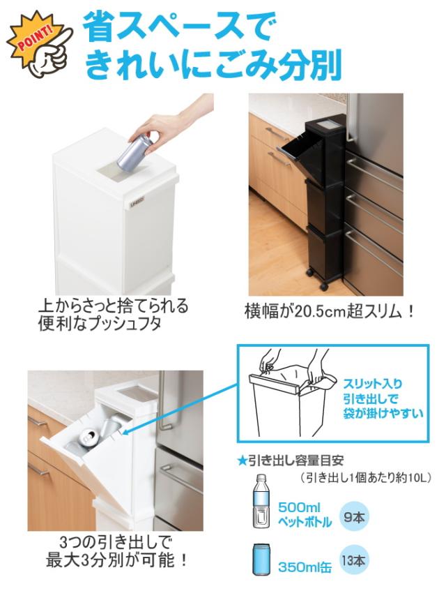 すっきりスリムなスタイルで狭いキッチンでも大活躍! 上段は上からさっと捨てられる便利なプッシュフタ。 大きなごみは引き出して捨てることができます。 スリット入り引き出しで袋が掛けやすい。 1台で最大3分別可能。 移動に便利なキャスター付き。 ブラック・ホワイトの2色からお選びください。 ※取り寄せ品のため、ご注文後のキャンセル・返品はできません。 |