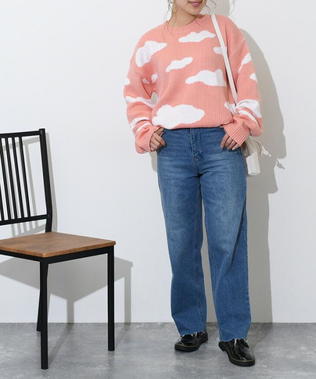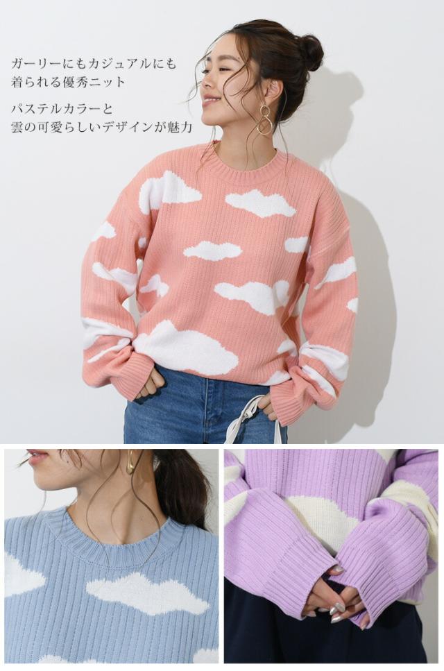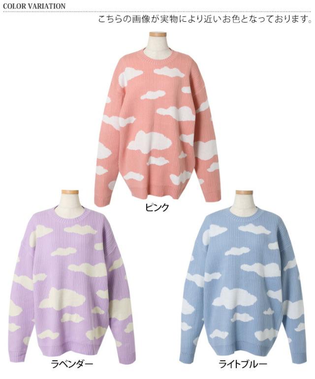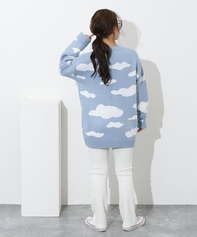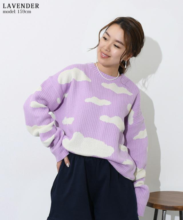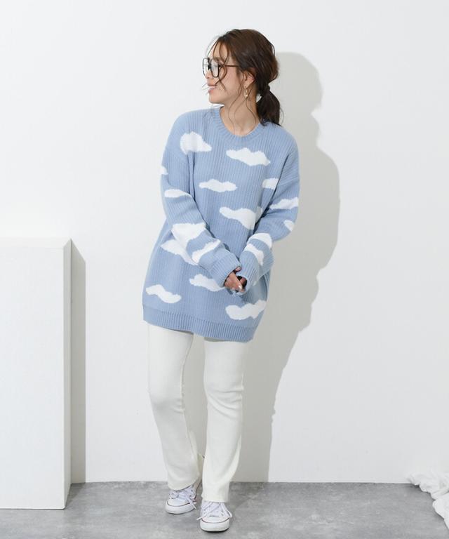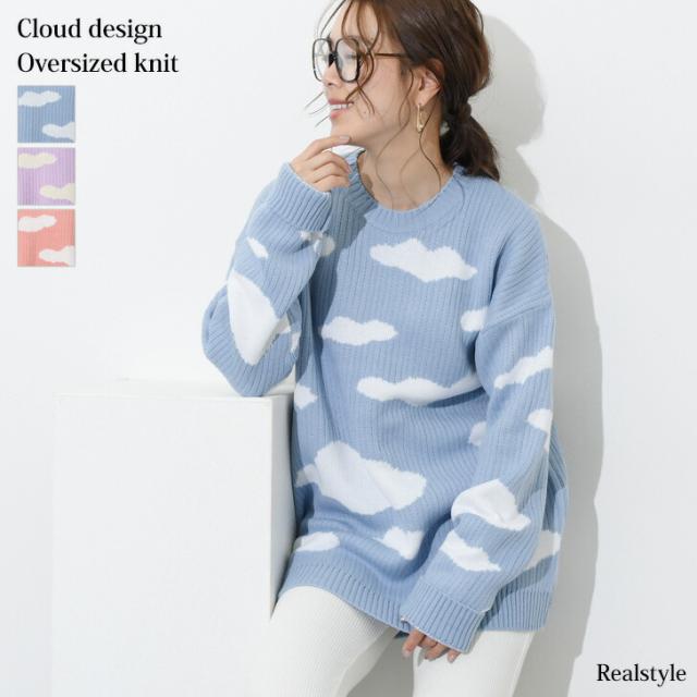 クラウドデザインオーバーサイズニット レディース 長め トップス 長袖 セーター リブ ゆったり 大きめ 大きいサイズ ビッグサイズ チュニック カジュアル 大人 楽ちん デザインニット 可愛い 雲 雲柄 天気 曇り
