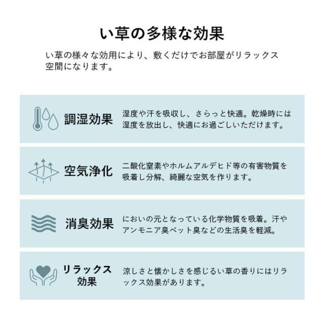 ●い草には空気の清浄作用、湿度の調整作用があり、汚れにくいといった特徴があります。敷くだけで畳のお部屋をリフレッシュできます。