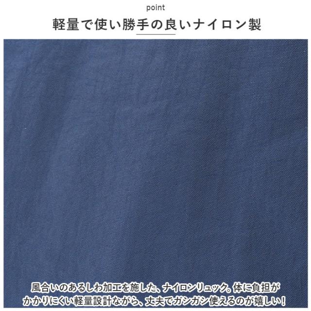 | 商品説明 | ・すっきり収納♪デイリー使いにぴったりな「Melody リュックサック」が新登場。 【ちょうどいいサイズ感】 ・大きすぎず小さすぎない!お出かけに必要な小物がしっかり収まり、満員電車などの人混みでも場所を取らないのが嬉しい♪ 【軽量で使い勝手の良いナイロン製】 ・風合いのあるしわ加工を施した、ナイロンリュック。体に負担がかかりにくい軽量設計ながら、丈夫でガシガシ使えるのが嬉しい! 【ガバっと開くダブルファスナー開口】 ・メインルーム開口部は、ラウンド型に開くダブルファスナー式。左右どちらからも開閉できて、出し入れもラクラク。 【B5サイズ対応でしっかり入る♪】 ・内側はB5サイズが縦向きにすっぽり。程よくマチがあり、見た目以上の収納力。 【小物が迷子になりにくい7ポケット】 ・タブレットを収納できるクッションポケット、小物を整理整頓できるフロントポケット、ボトル用サイドポケット、防犯面も安心のシークレットポケットを装備。 【アクセントをプラス】 ・ロゴ入りのフロントタグや、ファスナー引き手がさりげないアクセントに。 【ポケット仕様】 ・メインルーム:ファスナー式クッションポケット×1 ・前面:ファスナーポケット×3 ・サイド:ギャザーポケット×2 ・背面:シークレットポケット×1 |