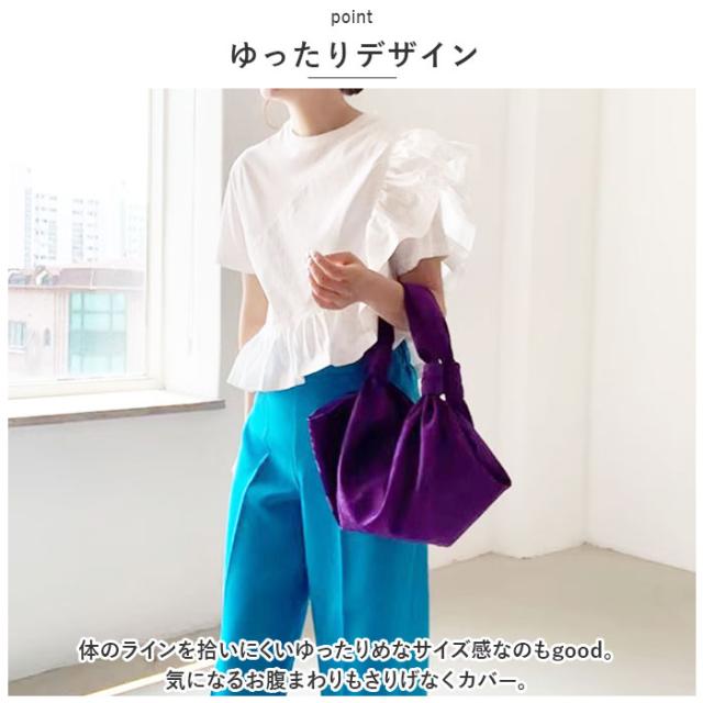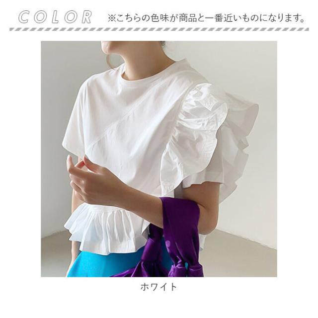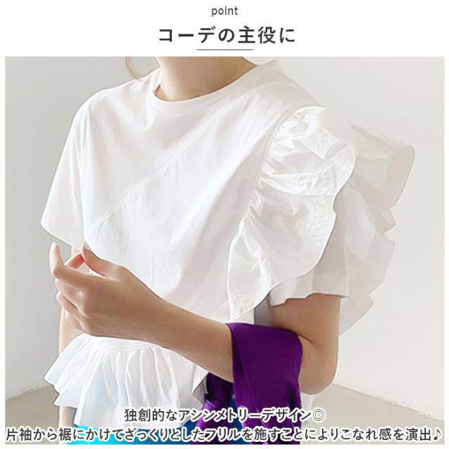 半袖 カットソー レディース 通販 Tシャツ トップス プルオーバー フリル袖 綿 コットン クルーネック 通勤 通学 カジュアル オフィスカジュアル 大人 上品 春 夏 おしゃれ かわいい アシメ 着痩せ 高見え 抜け感