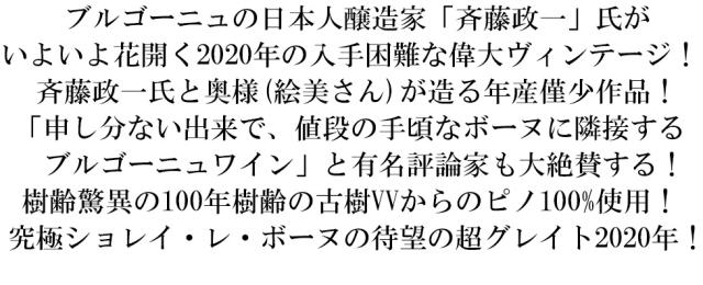 ブルゴーニュの日本人醸造家「斉藤政一」氏がいよいよ花開く2020年の入手困難な偉大ヴィンテージ! 斉藤政一氏と奥様(絵美さん)が造る年産僅少作品!「申し分ない出来で、値段の手頃なボーヌに隣接する ブルゴーニュワイン」と有名評論家も大絶賛する!樹齢驚異の100年樹齢の古樹VVからのピノ100%使用! 究極ショレイ・レ・ボーヌの待望の超グレイト2020年!■さまざまなギフトアイテムをご用意しております。
