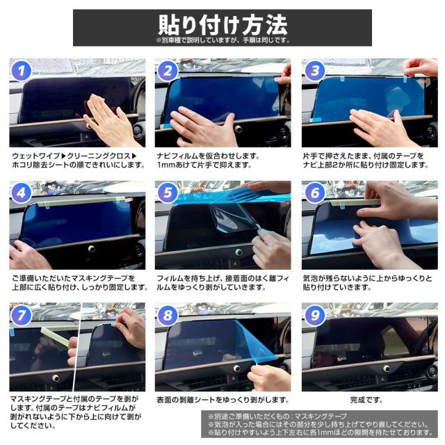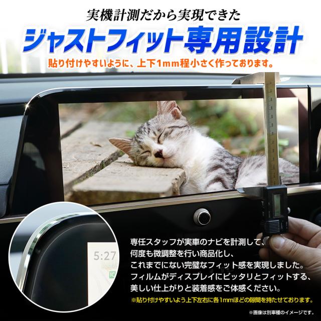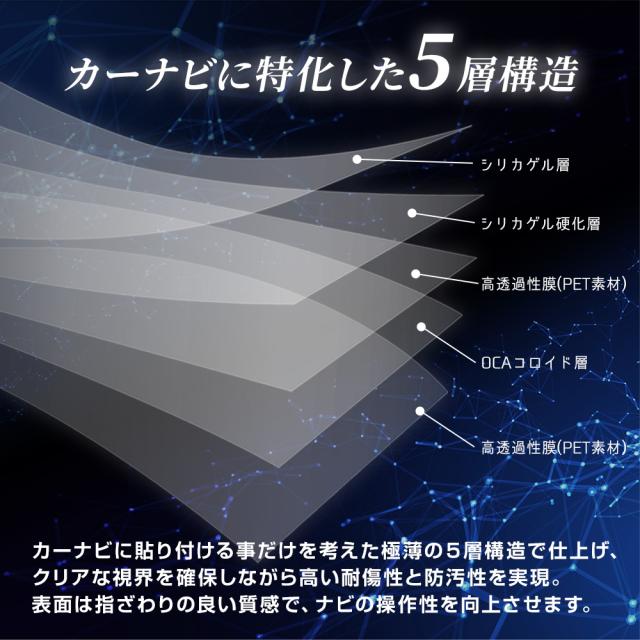 傷や指紋のベタベタからカーナビをしっかり守る!専用設計で取付簡単! 靭性の高いナノフィルムを使用した車種専用のオリジナルカーナビ保護フィルム! ●ガラスよりも靭性の高いナノフィルム採用 本製品は、靭性に優れたナノフィルムなのでガラスのように割れて破損する心配がありません。 しなやかな素材感がスムーズな貼り付けを実現し、ナビ表面と接着性が高く気泡の発生を最小限に抑えます。 ●カーナビに特化した5層構造 カーナビに貼り付けるために開発した極薄の5層構造で仕上げました。 クリアな視界を確保し、高い耐傷性と防汚性を実現。 フィルム表面は特殊コーティングにより指ざわりがよく、ナビの操作性を高めます。 ●表面硬度2H 極薄のナノフィルムですが、フィルム表面の硬度は2H! ナビを使用する上での傷をしっかりと防ぎます。 ●指紋を防いで操作性もアップ 指先で操作する事の多いカーナビは気が付いたら指紋がベタベタ…… 本製品を貼り付ける事により、指紋の付着を最小限に抑え、拭き取りも容易に! フィルム表面に施した特殊コーティングで指滑りの良いナビ操作が可能に! ●透過率91% フィルムの透過率は91%以上でクリアな視界を確保! 圧倒的にクリアな質感がナビにツヤを与え、視認性が高まる効果も。 ●実機計測のジャストフィット専用設計 本製品は、専任のスタッフが実車のナビを計測し、何度も微調整を重ねて製品化しております。 ディスプレイにぴったりフィットする美しい仕上がり、装着感をご体感ください。 ●万が一にも安心の2セット入り 本製品の貼り付けはとっても簡単!ですが、万が一に備えて2セット入り! 貼り付けに失敗してしまった場合や、貼り直しがしたい!という場合にも安心です。 |