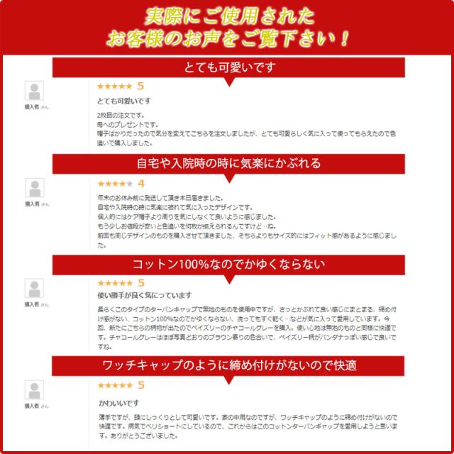 - 被りやすいです。ゴムはきつくも無くゆるくも無く長時間被っても痛くならないので助かります。綿100%でサラッとしています。配送も早くて助かります。