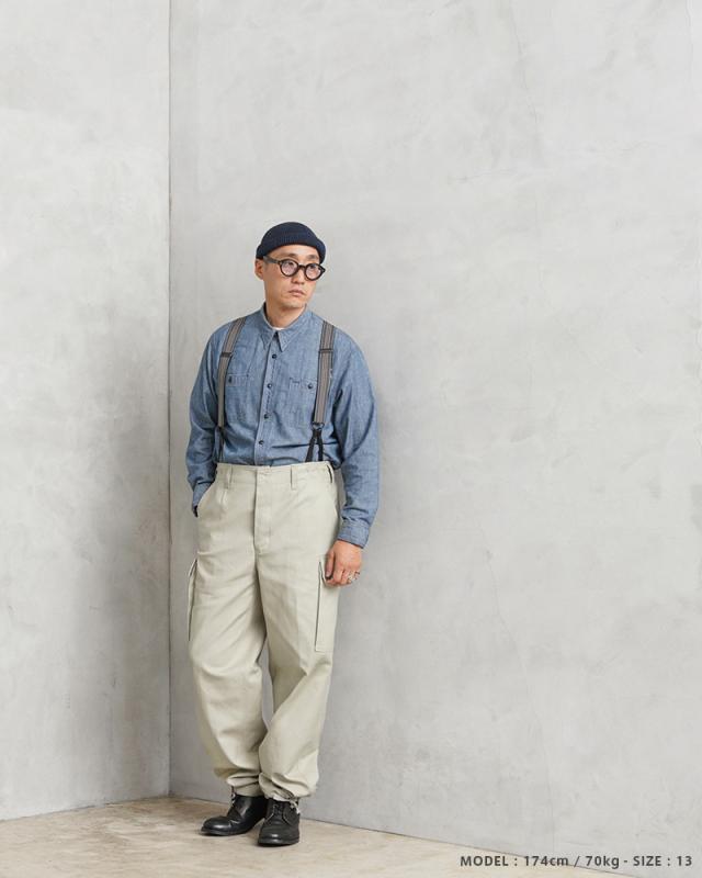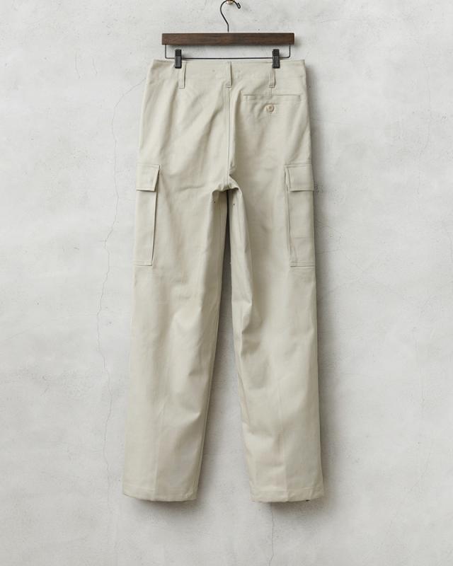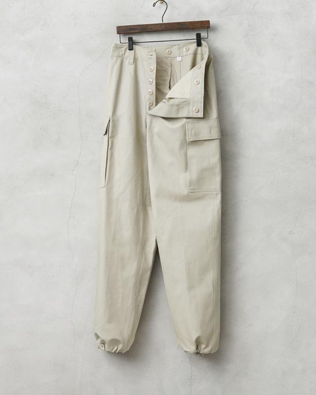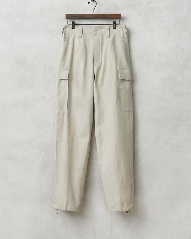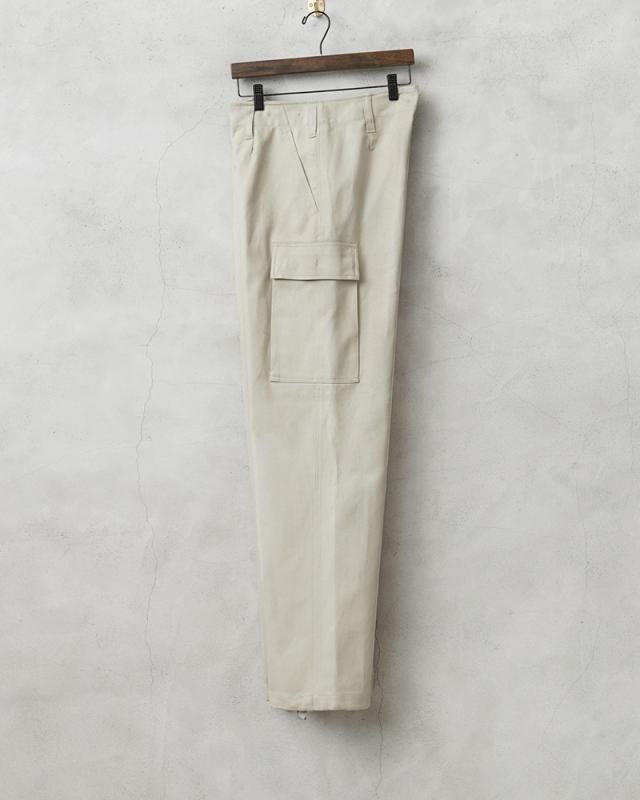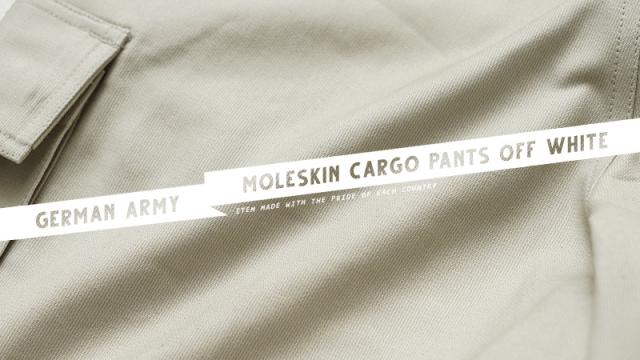 ドイツ軍の名作と名高いモールスキンカーゴパンツのオフホワイトバージョンが入荷しました!カーゴパンツ特有の野暮ったさはなく、きれいなシルエットが魅力で、テーパードが効いたシルエットは普段着のコーディネートに取り入れやすい洗練されたシンプルなデザインです。アイボリーのようなグレーがかったオフホワイトが印象的なカラーで、1990年代まで使用されていたカーゴパンツです。