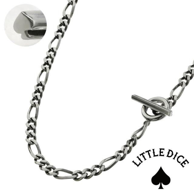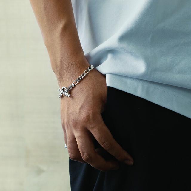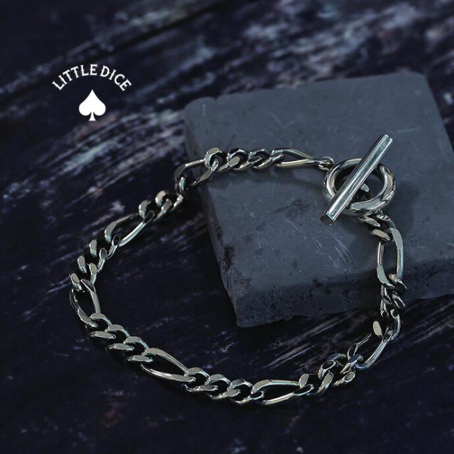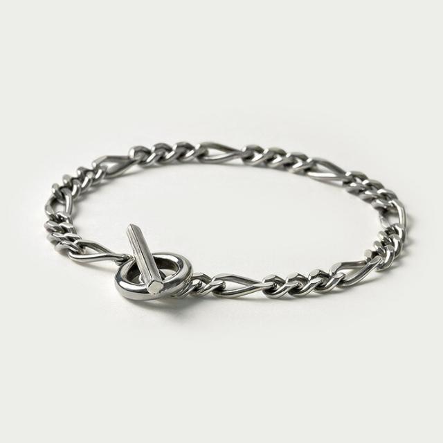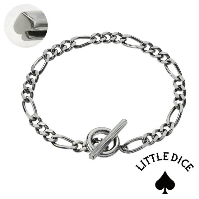 フィガロチェーンを使用したシンプルなブレスレットです。燻し加工を隙間に施すことにより、コントラストのあるハードな印象に仕上がっています。留め具は人気のマンテルデザインを採用、Tバーを輪に通すだけの着脱のしやすさが魅力です。Tバーの断面にはトランプのスペードをさりげなくデザイン。モチーフアクセとしてでなくシンプルなブレスレットとして楽しめる、使いやすさと遊び心を両立したアイテムです。
