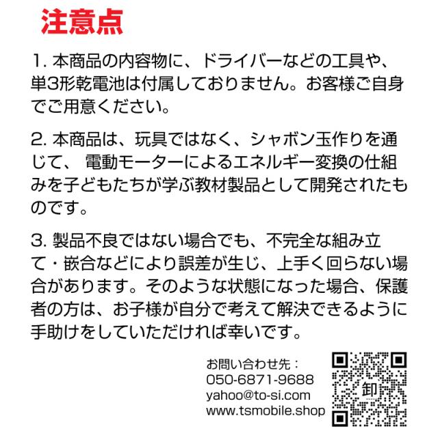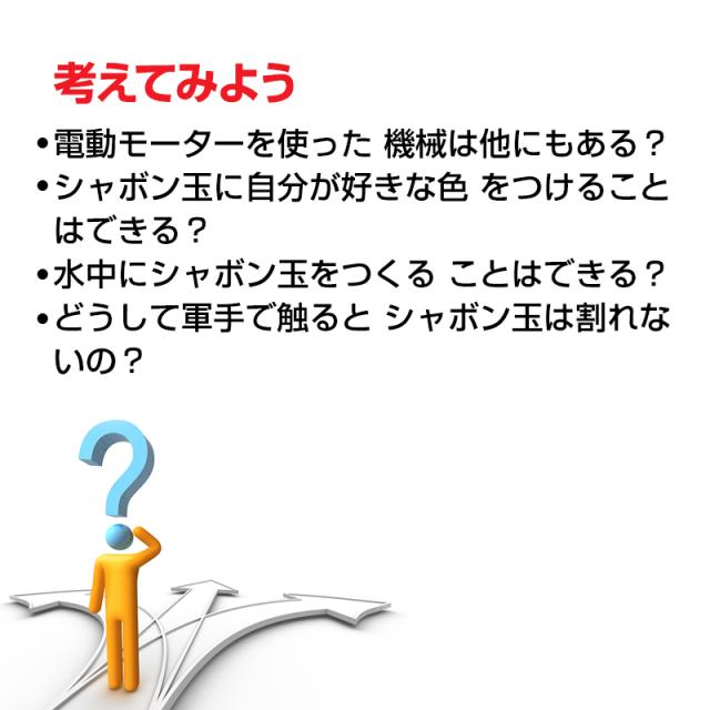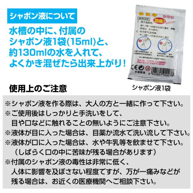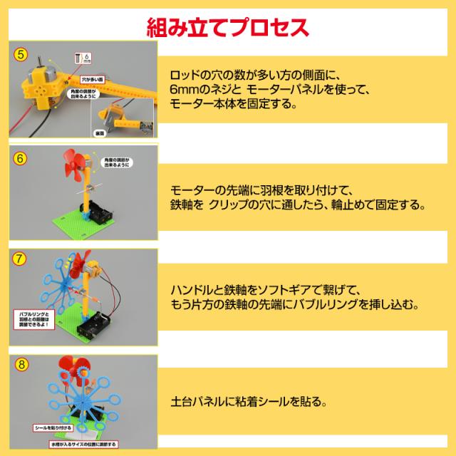 キット内容:組み立てマニュアル、組み立てキット(土台パネル、水槽、シャボン原液、バブルリング、電池ボックス、羽根、モーター、モーターパネル、ロッド、ロッドパネル、クリップ、鉄軸、ハンドル、ソフトギア、輪止め、粘着シール、4mmネジ、6mmネジ)