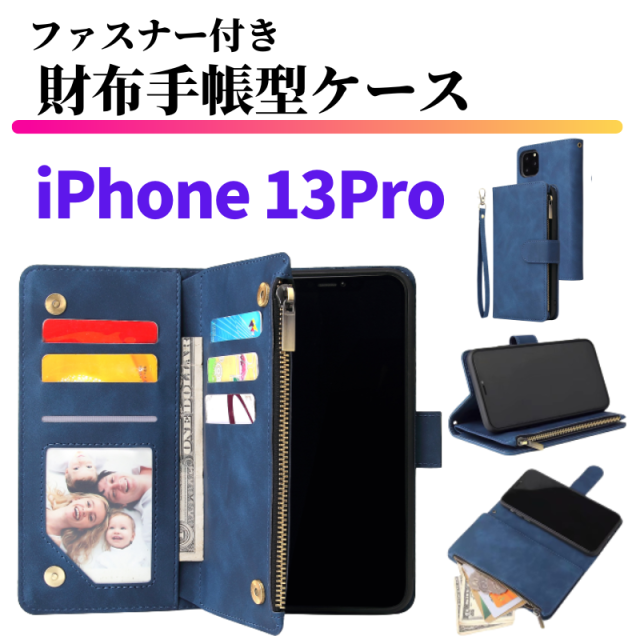 iPhone 13Pro スマホケース 手帳型 お財布 レザー カードケース ジップファスナー収納付 スタンド おしゃれ アイフォン カード入れ ストラップ付 大容量 耐衝撃 TPU素材 手帳 iPhoneケース 13 Pro ブルー
