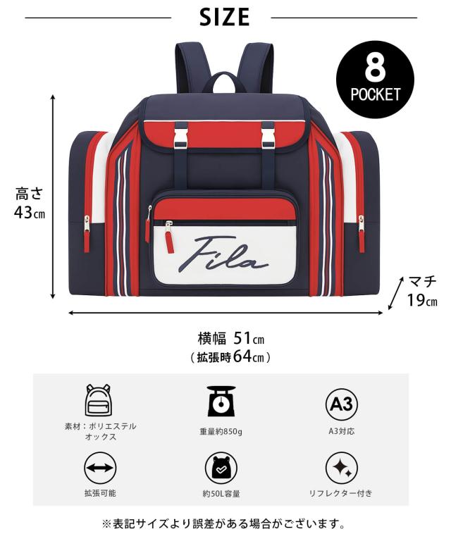\累計販売数7,200点突破!/(2025年5月末時点) ■素材 ポリエステルより更に軽い耐久性の高いポリエステルオックス素材で、お子様でも持ちやすい、修学旅行や林間学校等で大活躍です。 ■デザイン 収納力の高さに優れたキッズ用約50Lのビッグサブリュックが入荷! 人気スポーツブランドのFILAのサブリュックをkarlasが企画し限定で販売しております。 使いやすさを追求し、多機能性、デザイン共にこだわったFILA別注のサブリュックです。 ■機能 1.メイン部分に付いているファスナーをぐるりと開けると、容量が増えるエクスパンダブルタイプです。 2.口が大きく開くので収納しやすい!荷物の取り出しがしやすく収納力に優れています。 3.収納ポケットがたくさん!荷物がぐちゃぐちゃにならずに整理整頓上手! ※筆記体ロゴver.のみメインポケットに収納ポケットが増えました 4.軽さを追求したポリエステル素材で、安全性を考えてリフレクター機能をショルダーベルトとリュック本体に採用。 5.シンプルな色合い、デザインで年齢、性別を問わずお使いいただけます! かなりの大容量なので、旅行・アウトドア・ビジネス・修学旅行・自然学校、また、防災用など、様々な用途でご利用いただけます♪ |