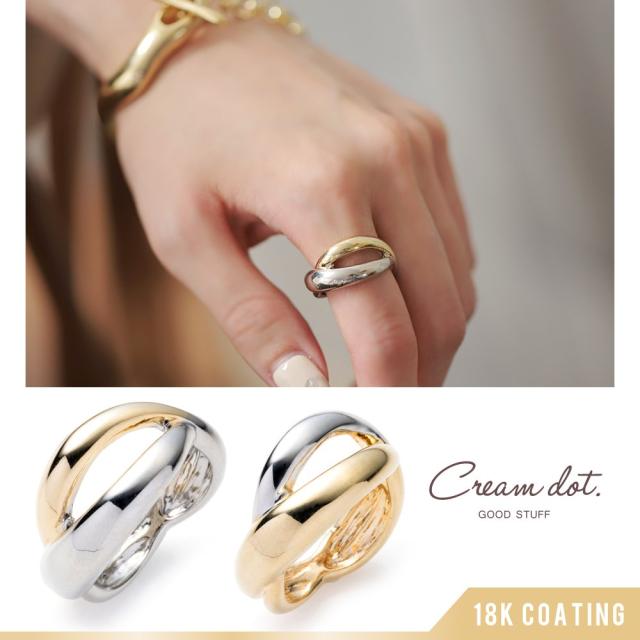 MIXカラーのぷっくりクロスリング。角度によってくるくると表情を変えるぷっくりフォルムが楽しめる洗練デザイン。ぷっくりとしたメタルラインとゴールド×シルバーのバイカラー使いが今っぽい◎