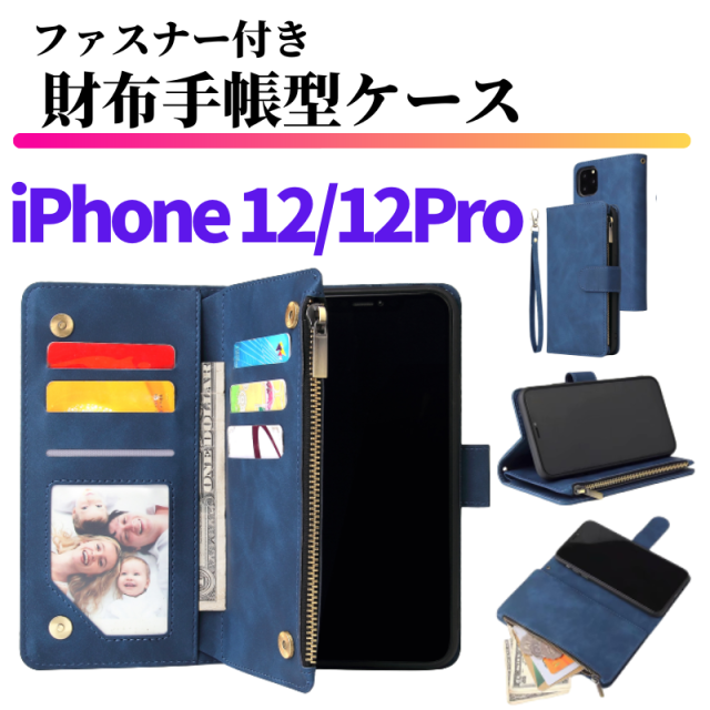 iPhone 12 12Pro スマホケース 手帳型 お財布 レザー カードケース ジップファスナー収納付 スタンド おしゃれ アイフォン カード入れ ストラップ付 大容量 耐衝撃 TPU素材 手帳 iPhoneケース Pro 12プロ ブルー