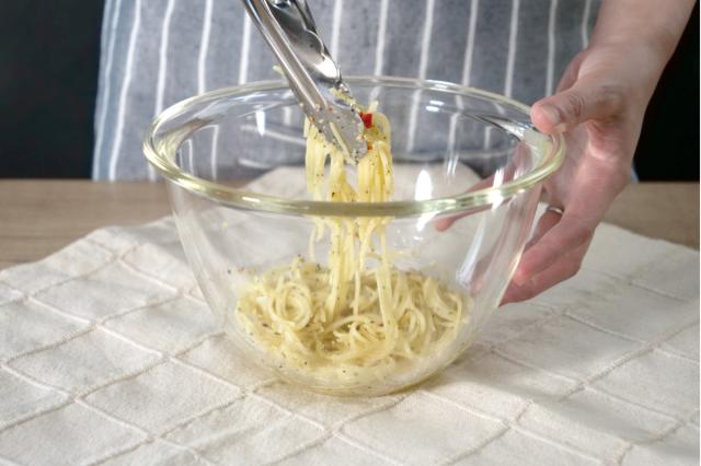 深い形状デザインなので、下ごしらえの際に食材がこぼれにくく混ぜやすいです。たっぷり入る容量でパスタもしっかり和えられます。