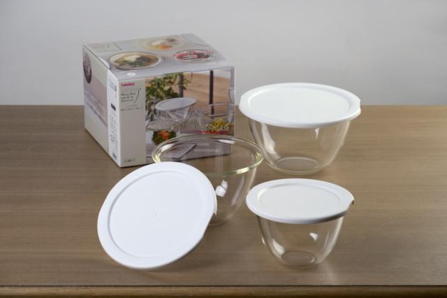 - サイズの違う3つのボールがとっても使い勝手がいいです。蓋を着けたまま電子レンジで温められるのもGood。深さがあるので、調理にも使いやすいし冷蔵庫の保存にもスッキリしまえてとっても重宝しています。